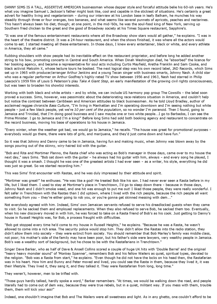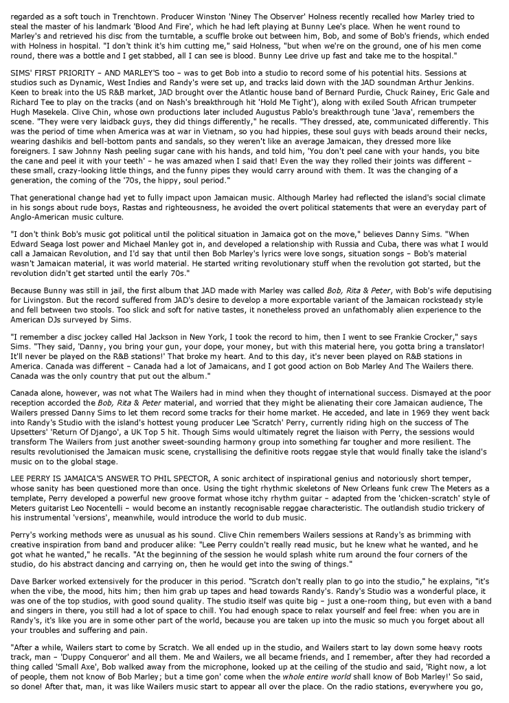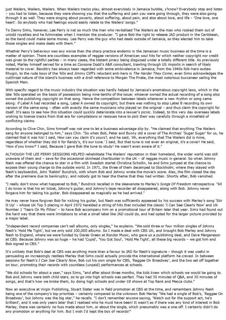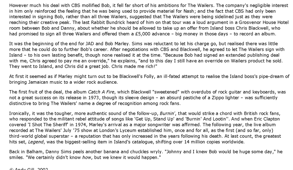 I present to you a brilliant article written by Andy Gill and published in the Mojo August 2002 edition. The article describes the period from 1966-1973, when Bob Marley, Peter Tosh, and Bunny Wailer penned many of the songs that would later catapult Bob Marley into super stardom. It also discusses the relationship between Bob and Danny Sims and Johnny Nash, American musicians/producers/accused pirates. I find it amusing that Danny Sims accuses Lee “Scratch” Perry of pirating Wailers material, when as I write this, Sims and Nash are accused of the same (and even worse) by Bunny Wailer. I will not comment on the accusations of piracy, or the presumed guilt or innocence of the parties discussed in the article. I simply present it as information for fans interested in this period of The Wailers’ development.