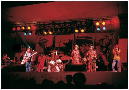 Bob Marley and the Wailers, on tour promoting the Natty Dread album, played the opening summer show of the festival on a hot and muggy June 18, 1975. The show is notable because it is one of the few live performances featuring the only white member of The Wailers, harmonica player Lee Jaffe. Jaffe plays harmonica on “Rebel Music (3 O’clock Road Block)” and “Talkin’ Blues”.
