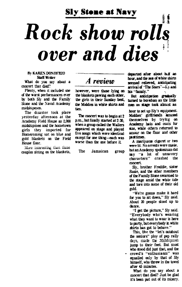 This is a review for a show that took place on October 14, 1973 at the Naval Academy Field House in Annapolis, MD, USA. The review was published in The Capitol News on October 15, 1973.