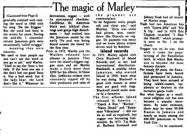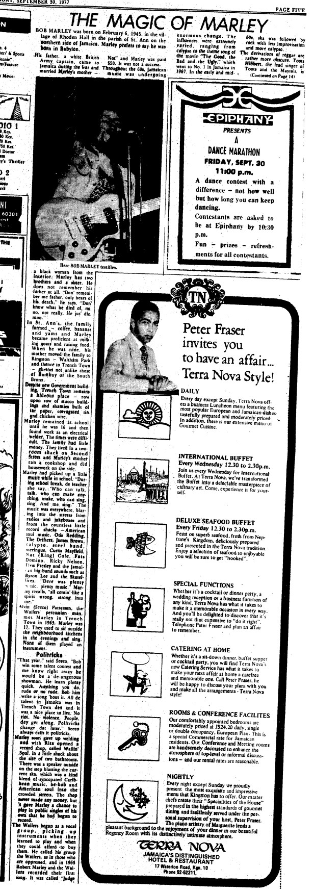 This is Parts 3 and 4 of a 5-part series originally published in the New York Times Magazine and the Jamaica Gleaner on September 30, 1977 profiling Bob Marley in 1977.
