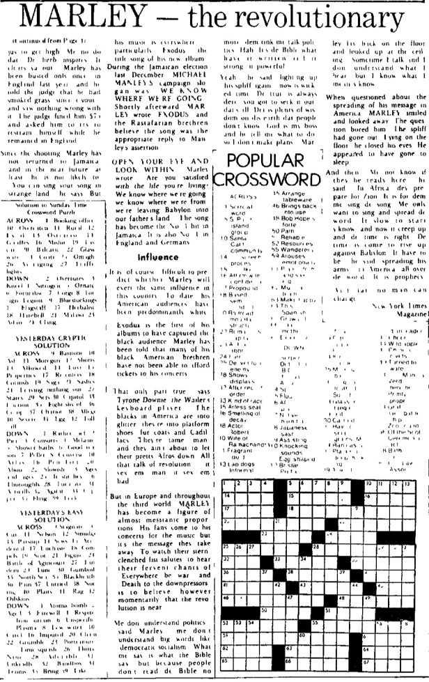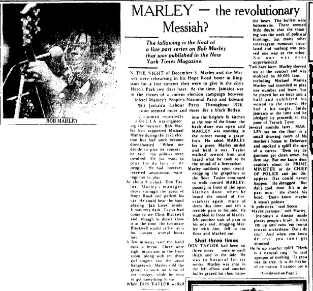 The following is the final in a 5-part series on Bob Marley published in the New York Times Magazine and The Jamaica Gleaner on October 3, 1977.