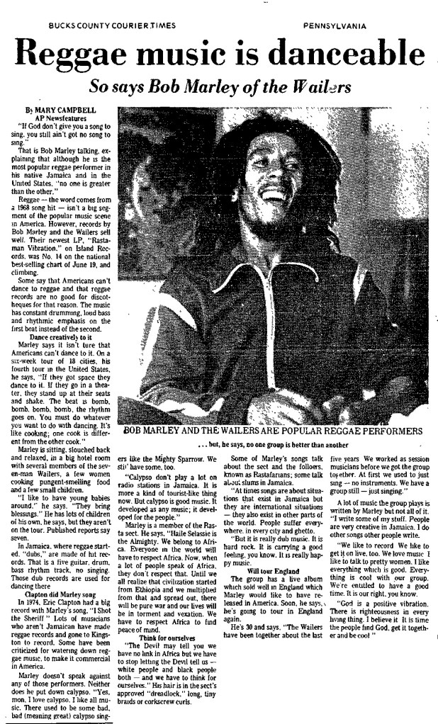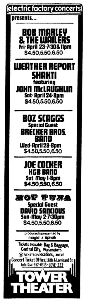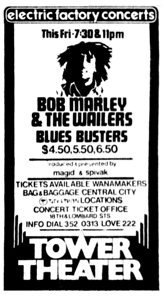 Bob Marley and the Wailers open their Rastaman Vibration Tour at the Tower on April 23, 1976. It’s a special night for Bob and The Wailers. They are scheduled to play two shows. Bob’s mother, Cedella Booker, will travel the 30 minutes from her home in nearby Wilmington, Delaware to see her son, now a bona fide rock star, play at a North American venue for the first time. The Wailers, now sporting roots guitarist Donald Kinsey and a game Earl “Chinna” Smith, are both excited and apprehensive about playing the new songs off their Rastaman Vibration album – which will hit stores the following week on April 30, 1976. What a way to introduce the new songs…to an eager audience in one of North America’s most historic cities.