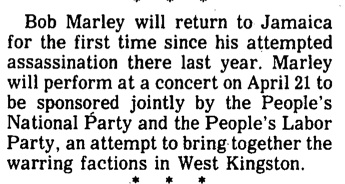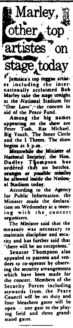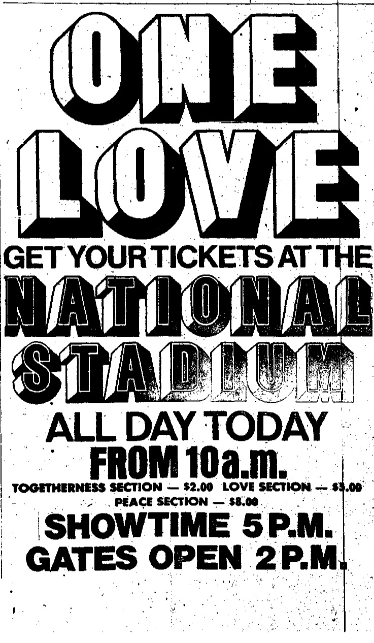 This concert is held during a political civil war in Jamaica between opposing parties Jamaican Labour Party and the People’s National Party. It brings together 16 of Reggae’s biggest acts, and is dubbed by the media as the “Third World Woodstock”, “Bob Marley plays for Peace” and simply, “Bob Marley Is Back.” The concert attracts more than 32,000 spectators with the proceeds of the show going towards “much needed sanitary facilities and housing for the sufferahs in West Kinston.”