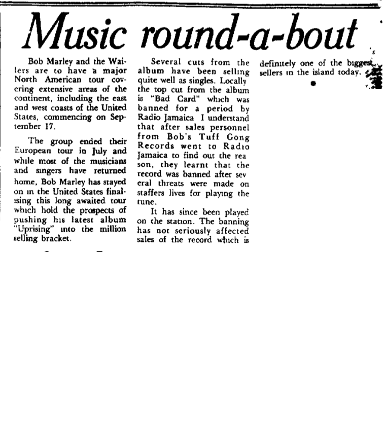 In 1980, upon the release of the single “Bad Card” from the Uprising album, the Jamaican government moves to ban the song from Jamaican airwaves because of it’s negative political connotations. Bob Marley, a Peoples National Party supporter, sees two of his songs from the Uprising album (“Bad Card”, “Coming In From The Cold”) used in political ad campaigns by both parties. For his part, Marley adorns the cover of his Uprising album with rising suns, a PNP symbol, as well as clenched fists, the Socialist party symbol that PNP is aligned with.