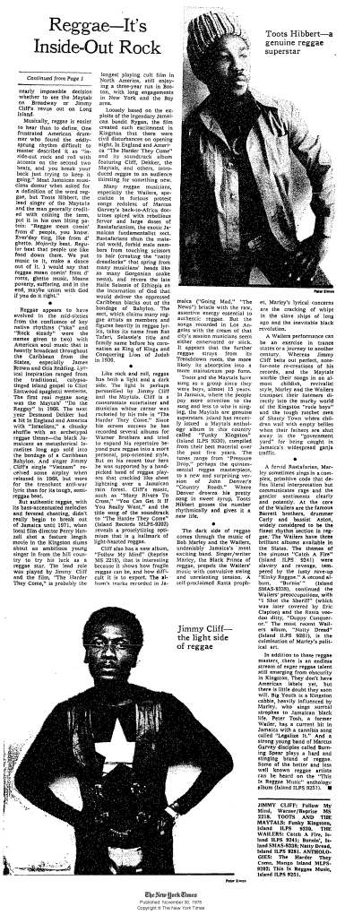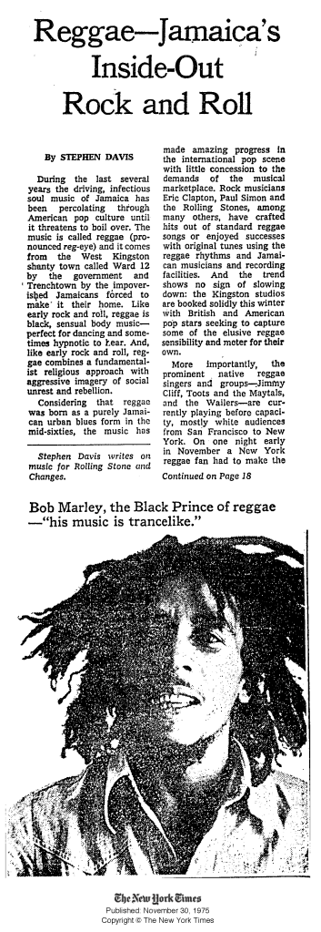 The following article is from the New York Times press archives. Written by noted Marley biographer Stephen Davis and published on November 30, 1975, the article describes the emerging global phenomenon of reggae music and Marley’s place in the movement.