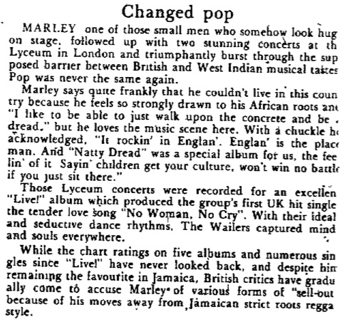 In this post I am sharing press clippings and additional media related to Bob Marley and the Wailers’ performances in London during the summer of 1975.