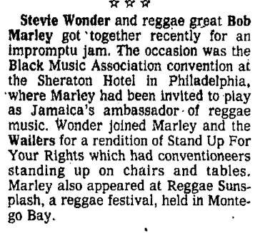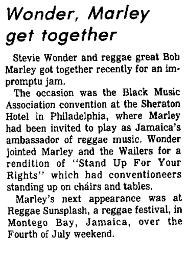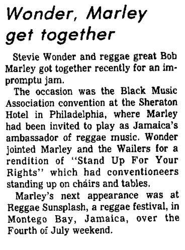 After his performance with Marley in Philadelphia, Stevie Wonder is inspired to write the track “Master Blaster (Jammin’),” which is included on the album Hotter Than July.
