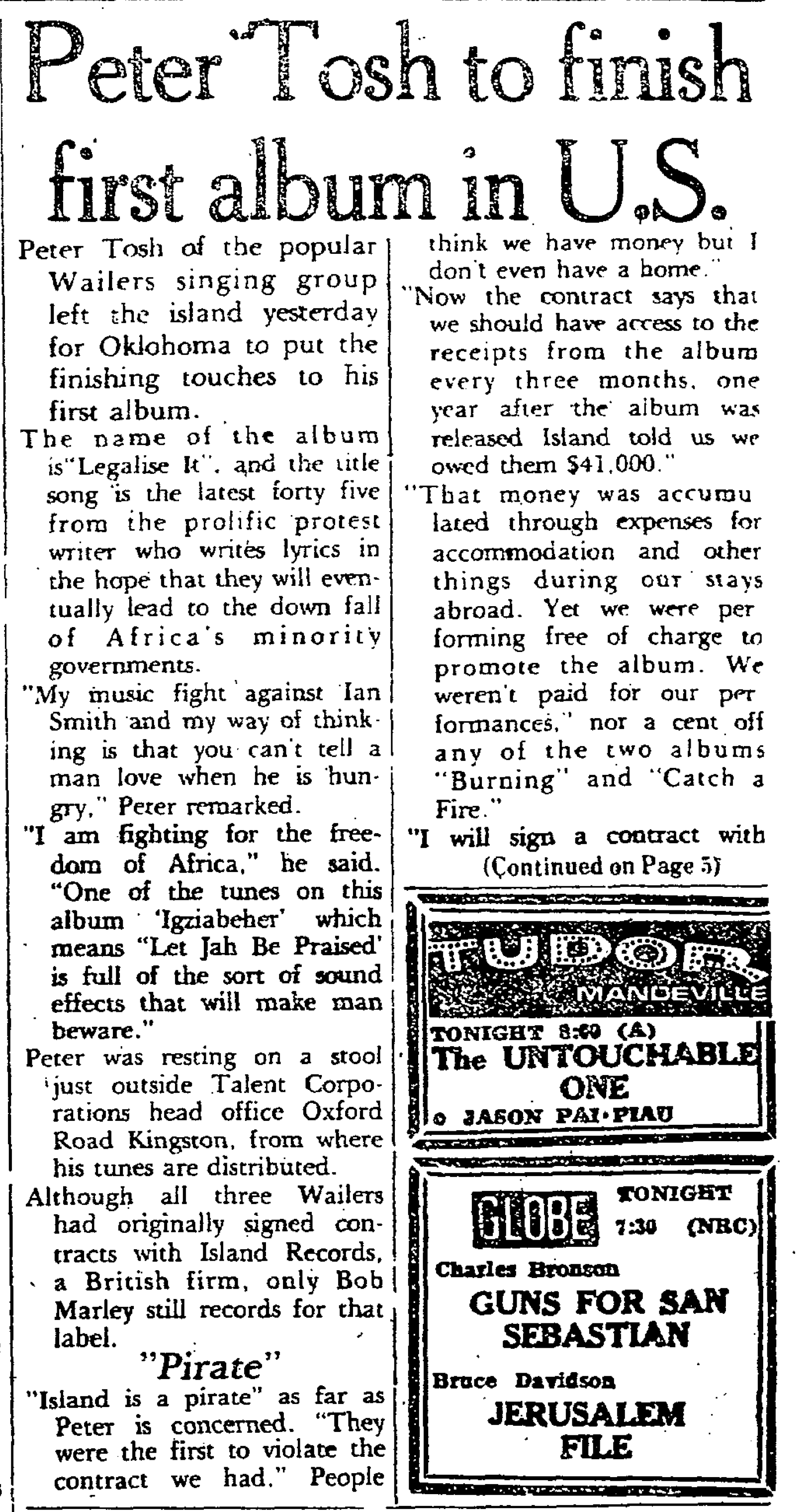 I have included a NPR podcast titled Reclaiming A Wailer and a Jamaica Gleaner article that discusses the recording of Tosh’s seminal debut album Legalize It.