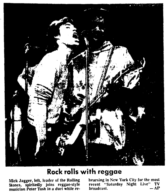 Tosh plays December 6th and 7th, 1978 at the Rainbow Theatre in London before flying to NYC to appear on Saturday Night Live on December 16, 1978, the same day Vivien Goldman reviews these shows in Melody Maker.
