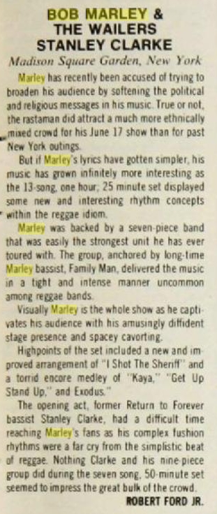 Here is a review of the MSG 1978 show from Billboard Magazine July 8, 1978. Shared by my good friend Fred at http://voiceofthesufferers.free.fr/.
