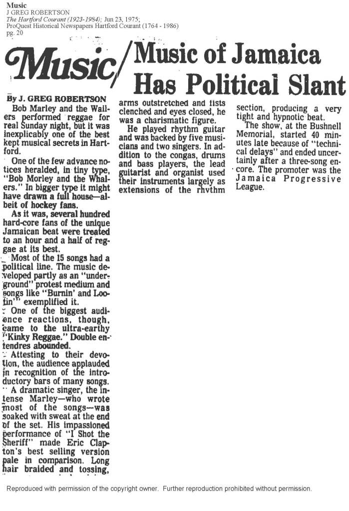 Included is a concert review published June 23, 1975 in the Hartford Courant.  This article was shared with the Midnight Raver Blog by regular contributor Fred from http://voiceofthesufferers.fr.