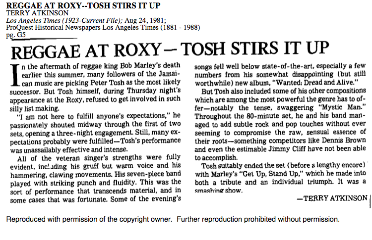 Today I’m sharing a rare rehearsal tape from the Roxy Theatre in Hollywood, CA.  Tosh and his band rehearse for their show at the Roxy on August 20, 1981.  I have also included a review of the show written by Terry Atkinson and published in the Los Angeles Times on August 24, 1981.