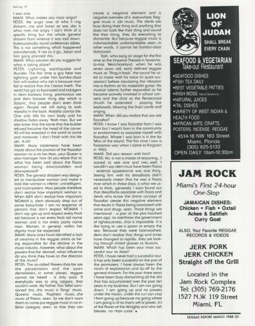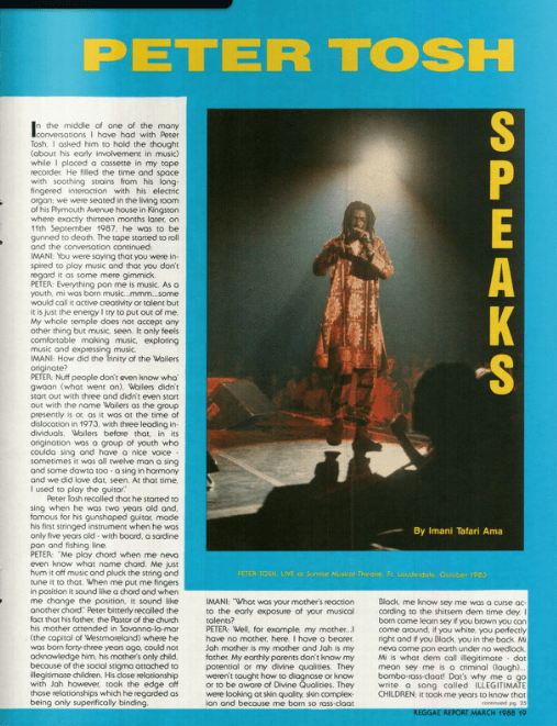 Interviews, Peter Tosh, Press Archives Peter Tosh: Interview (Published 1988) Date: September 8, 2012Author: legendaryreggae 1 Comment Included here is a rare interview with the late, great Peter Tosh, which appeared in the Reggae Report in September 1988. CLICK ARTICLE IMAGES TO READ ON ISSUU. Share this: Click to share on Facebook (Opens in new window) Facebook Click to share on LinkedIn (Opens in new window) LinkedIn Click to share on X (Opens in new window) X Click to email a link to a friend (Opens in new window) Email Click to print (Opens in new window) Print Click to share on Reddit (Opens in new window) Reddit Click to share on Tumblr (Opens in new window) Tumblr Like Loading... Related