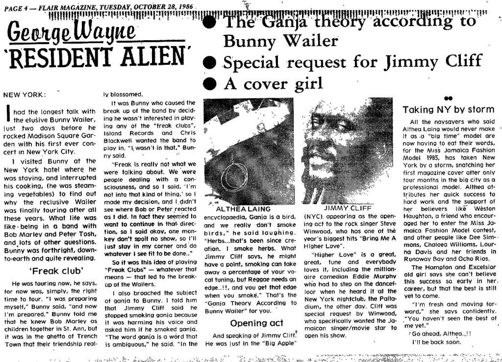 In this rare interview feature by George Wayne which was published in the October 28, 1986 issue of Flair Magazine, Bunny Wailer discusses his role in the break-up of the original Wailers trio.