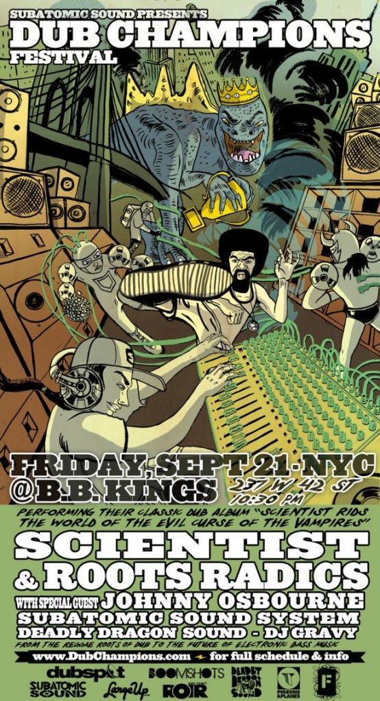 Scientist & Roots Radics rid NY of the Evil Curse of the Vampires! w/special guest Johnny Osbourne and opening sets from Subatomic Sound System, Deadly Dragon Sound System, Deejay Gravy. Details & RSVP here: http://bit.ly/SRRdcE Sign up at www.DubChampions.com for ticket discounts — at B.B. King Blues Club.
