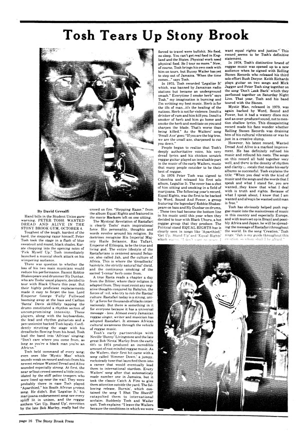 Peter Tosh, Press Archives Peter Tosh: Stony Brook Press, V. 3 #4, October 15, 1981 Date: September 21, 2012Author: legendaryreggae 0 Comments Another rare find for the MIDNIGHT RAVER BLOG! CLICK ARTICLE TO READ ON ISSUU Share this: Click to share on Facebook (Opens in new window) Facebook Click to share on LinkedIn (Opens in new window) LinkedIn Click to share on X (Opens in new window) X Click to email a link to a friend (Opens in new window) Email Click to print (Opens in new window) Print Click to share on Reddit (Opens in new window) Reddit Click to share on Tumblr (Opens in new window) Tumblr Like Loading... Related