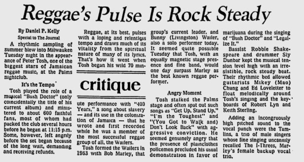 Here we present a concert review published in the Milwaukee Journal on February 27, 1979 which critiques Tosh’s performance the previous night (February 27, 1979) at the Palms night club in Milwaukee, WI.  There is currently no published record of this show that we could find.