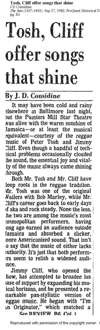 The latest addition to the growing list of undocumented shows involves a show which occurred on September 26, 1982 at Painters Mill Star Theatre in Owings Mills, MD, which is just outside Baltimore. Jimmy Cliff, who joined the Mama Africa tour as opening act in August 1982, opens for Peter Tosh on what is described in the attached review as a cold and rainy night frought with technical problems.