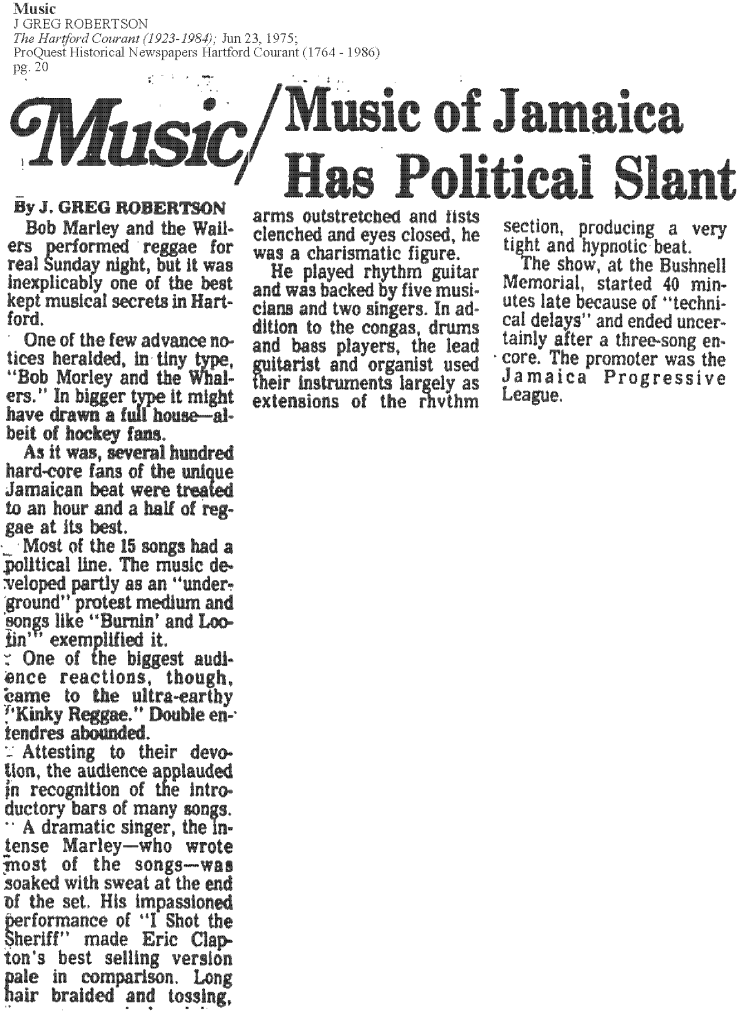 Included here is a review for a show played by the Wailers on June 22, 1975 at the Bushnell Auditorium in Hartford, CT. The review, written by J. Greg Robertson, was published in the Hartford Courant on June 23, 1975.