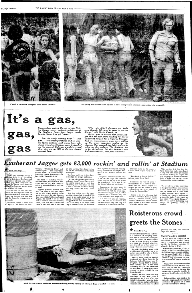 Peter Tosh and Kansas open for the Rolling Stones on the Some Girls tour at Cleveland Stadium (now Progressive Park) on Saturday, July 1, 1978. The review of the show was published in the Cleveland Plain Dealer on Sunday, July 2, 1978.