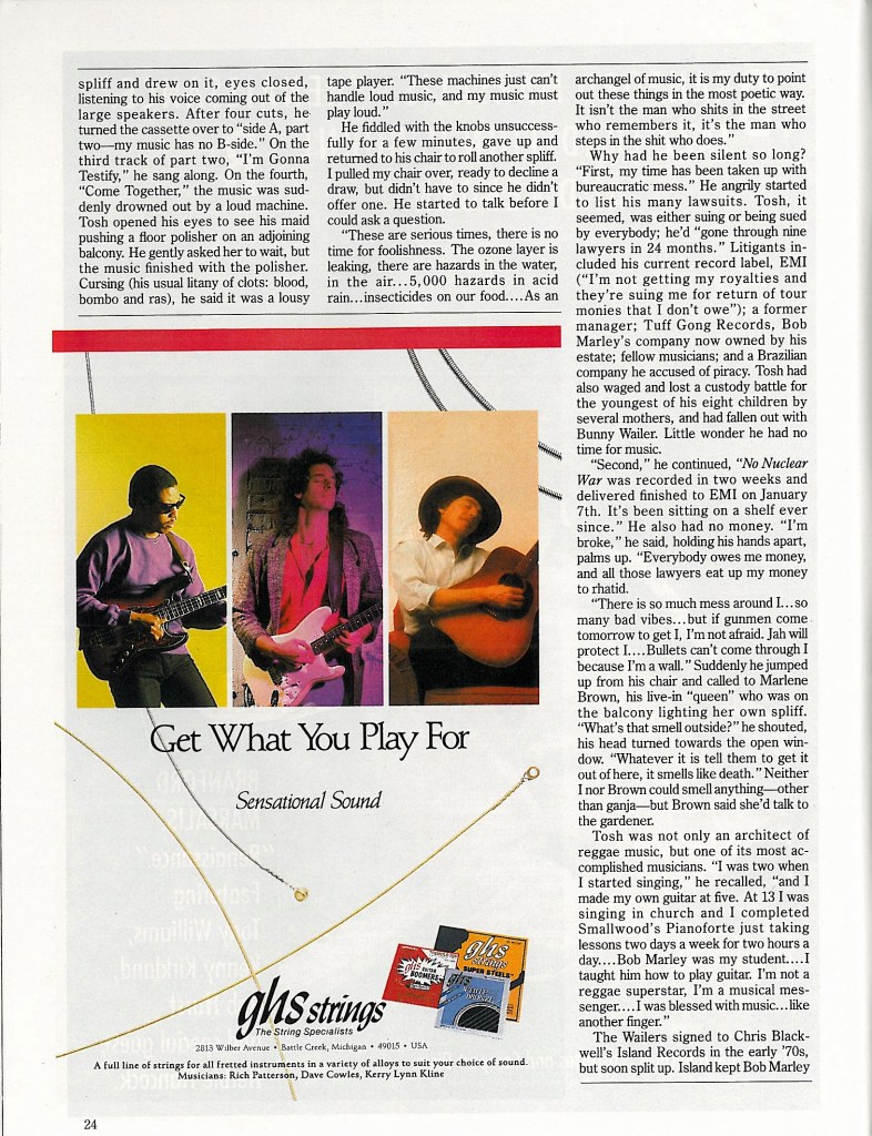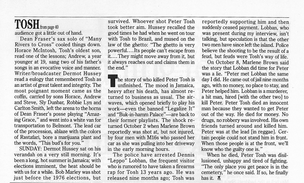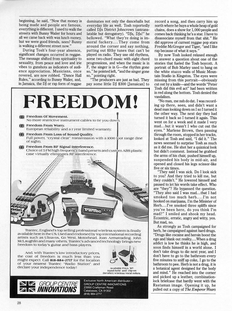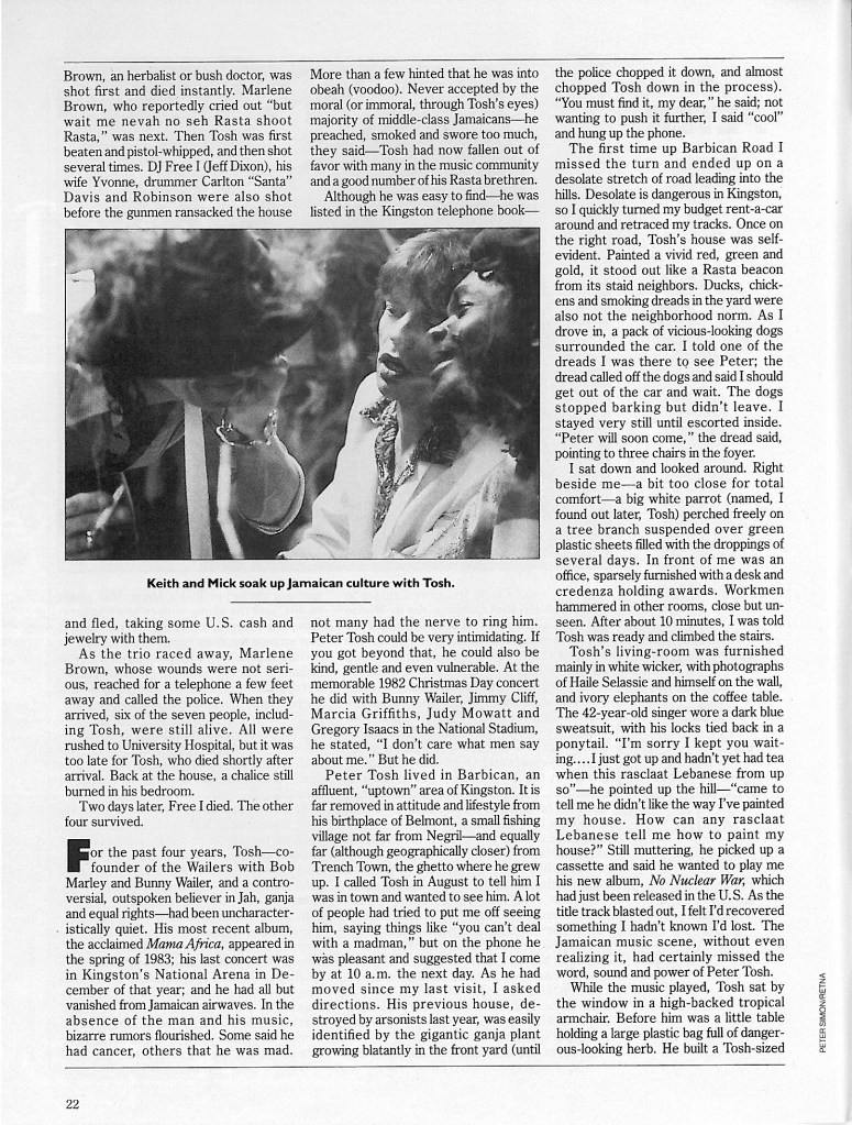 Included here is Peter Tosh’s last published interview which was published in December 1987, just three months after his brutal murder. The interview was conducted by Maureen Sheridan for MUSICIAN MAGAZINE. It is somewhat ironic that Sting blesses the cover of this issue. You see The Police (a group heavily influenced by reggae) were one of the few groups that emerged in the late 1970s just as reggae began to lose its grip on the world. After the death of Bob Marley, Island Records briefly flirted with the idea that Black Uhuru would be the next great reggae act to take the world by storm. Chris Blackwell even arranged a massive European tour which featured Black Uhuru opening for The Police. Blackwell’s support of reggae was short lived though as Island Records completely divested in reggae by 1984, dropping Black Uhuru from the label and putting all of their money and marketing power behind a small emerging band from Dublin called U2. The rest, as they say, is history…