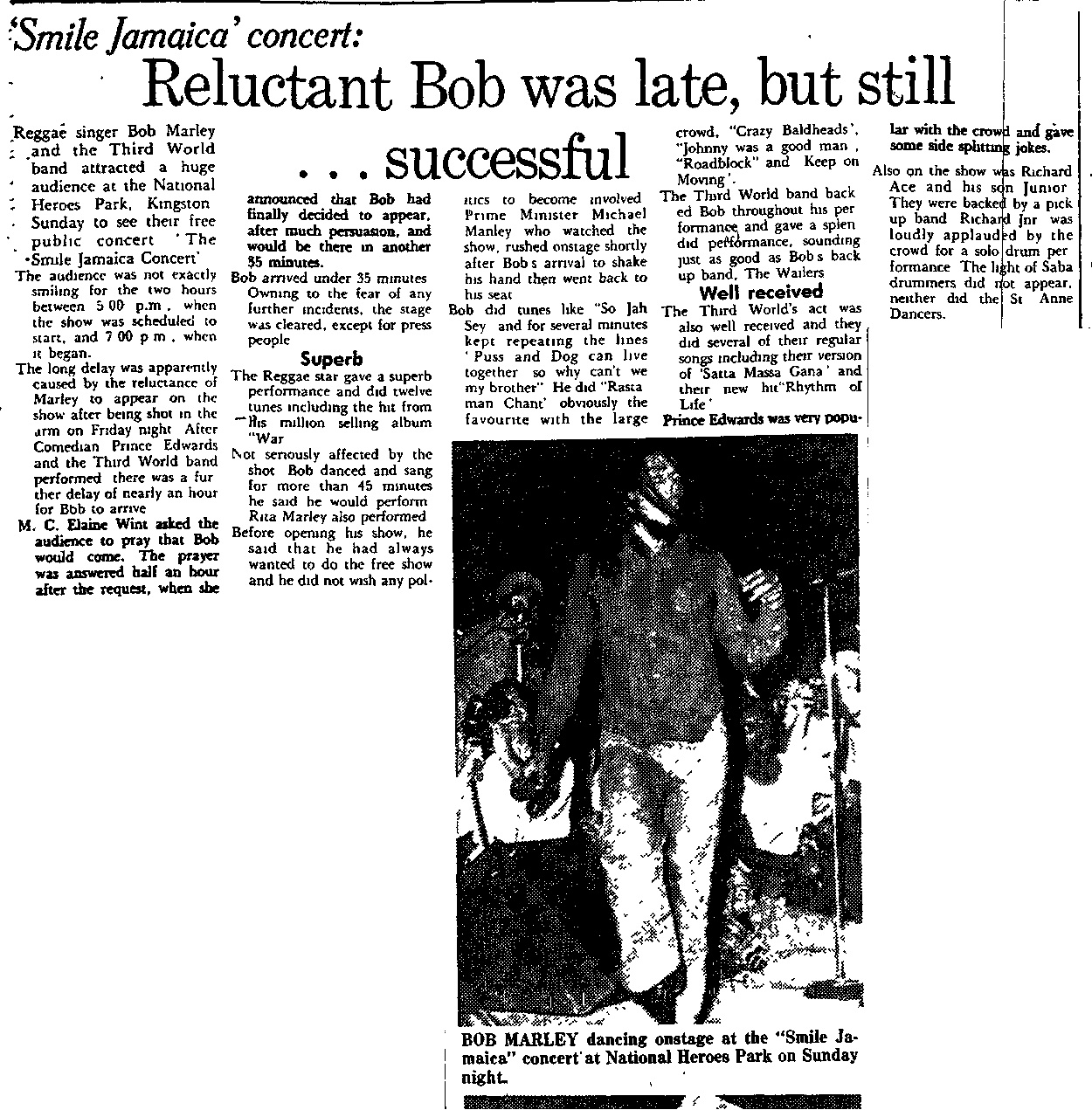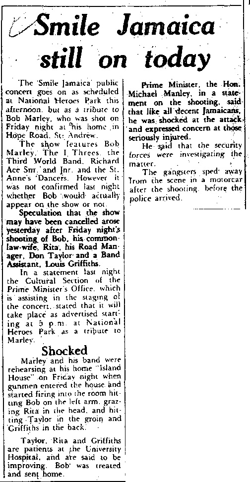 The Smile Jamaica Concert scheduled for December 5, 1976, 1 and 1/2 days after Marley’s attempted assassination, is still slated to go on: