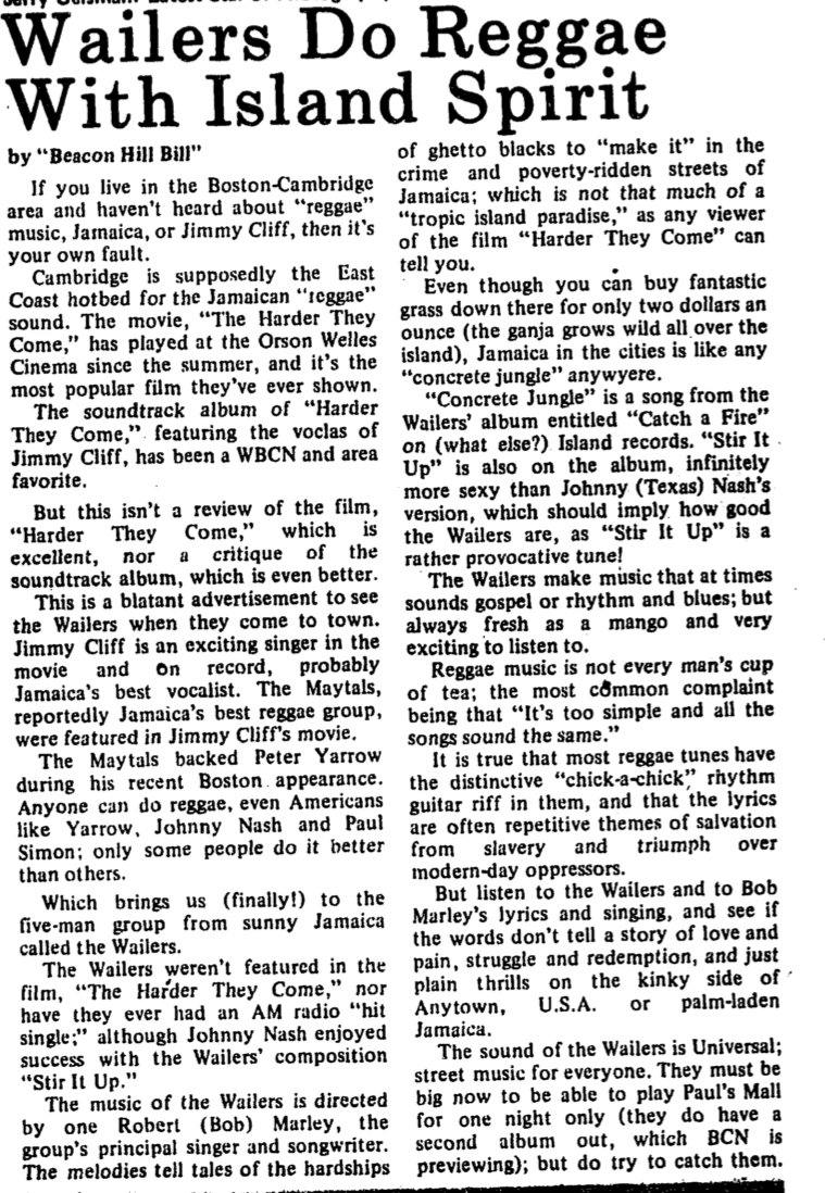 Today I share with you an article by “Beacon Hill Bill” that was published on October 31, 1973, a few months after The Wailers played Paul’s Mall in Boston.