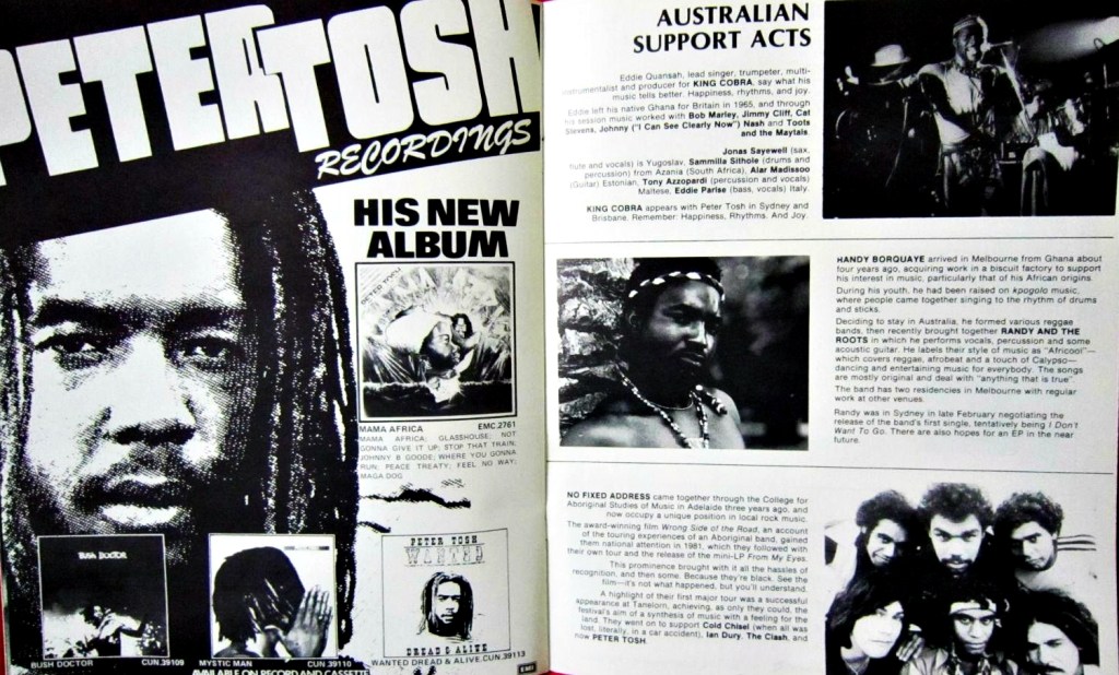 Randy Borquaye and the Roots. Randy Borquaye, also from Ghana, arrived in Australia in 1979 and worked in a biscuit factory to support his love for music. They open for Tosh in Sydney.