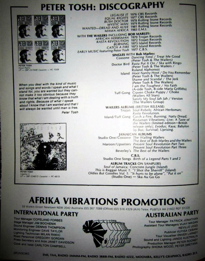 It is during March 1983 that Peter Tosh takes his Mama Africa global tour to Australia and New Zealand. Here is a listing of the Australian dates and venues to the best of our knowledge.