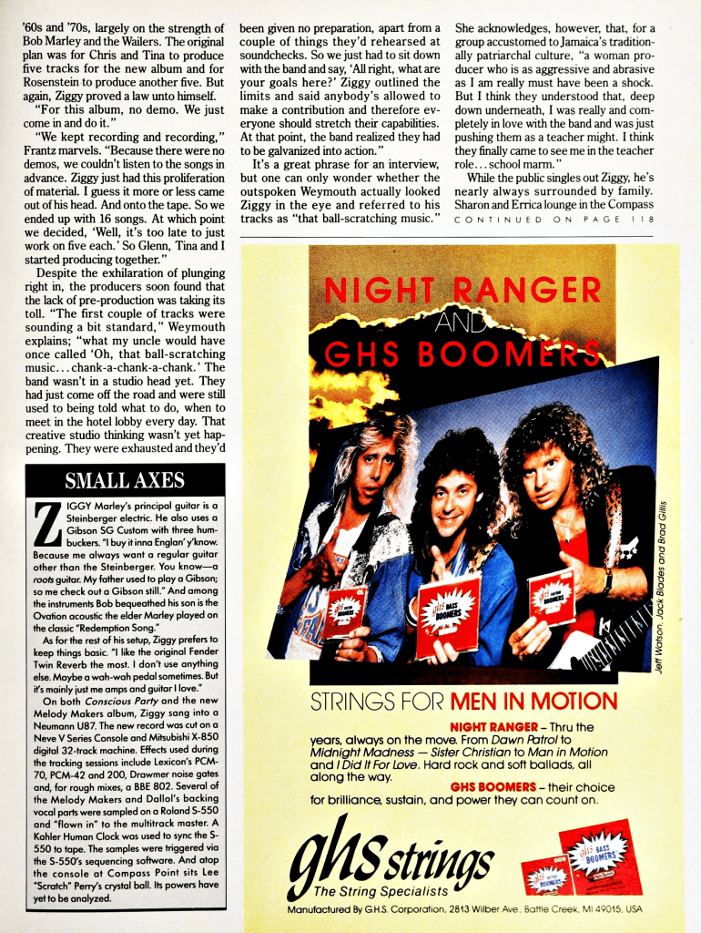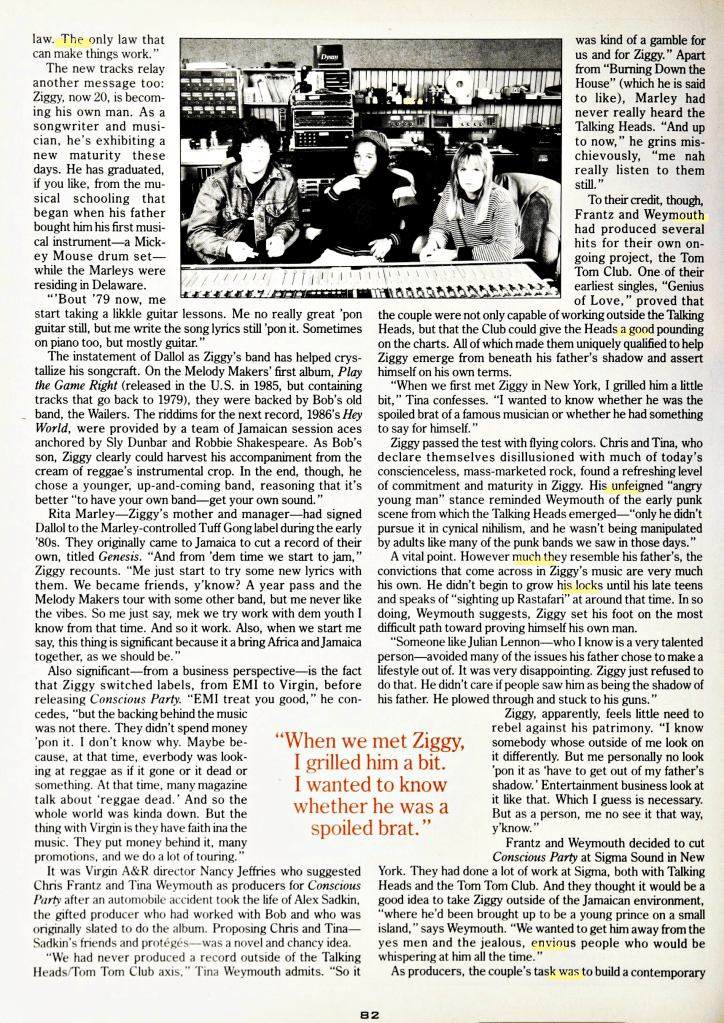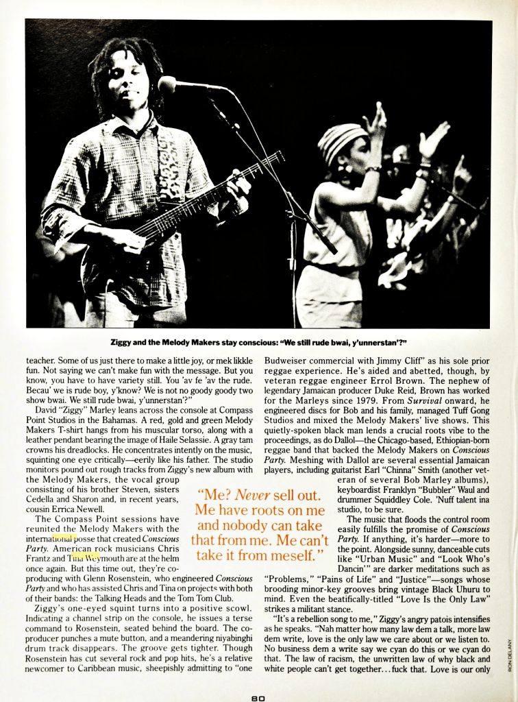 This great article by Alan di Perna finds Ziggy Marley at Compass Point recording studios with producers Chris Frantz and Tina Weymouth crafting what would become an exemplary album – ‘One Bright Day.’ The interview was published in Musician magazine on July 1, 1989. This is the only article I’ve read which includes quotes from Frantz and Weymouth, formerly of the Talking Heads, who really were able to get the very best out of Ziggy Marley and the Melody Makers for those first 2 major label albums. Great stuff here…