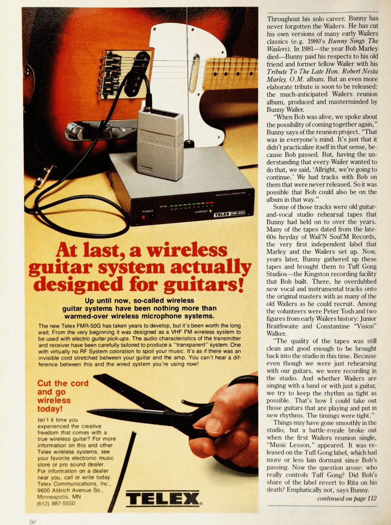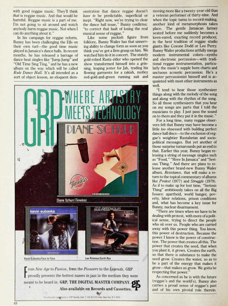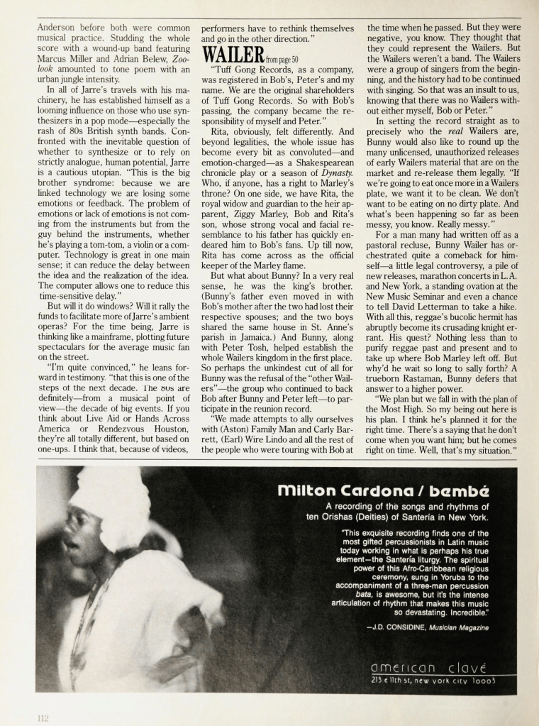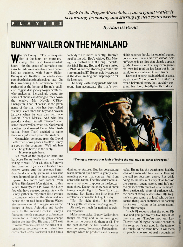 Also, Bunny Wailer in Musician magazine, written by Alan Di Perna and published November 1986 as Wailer embarks on his first US solo tour.