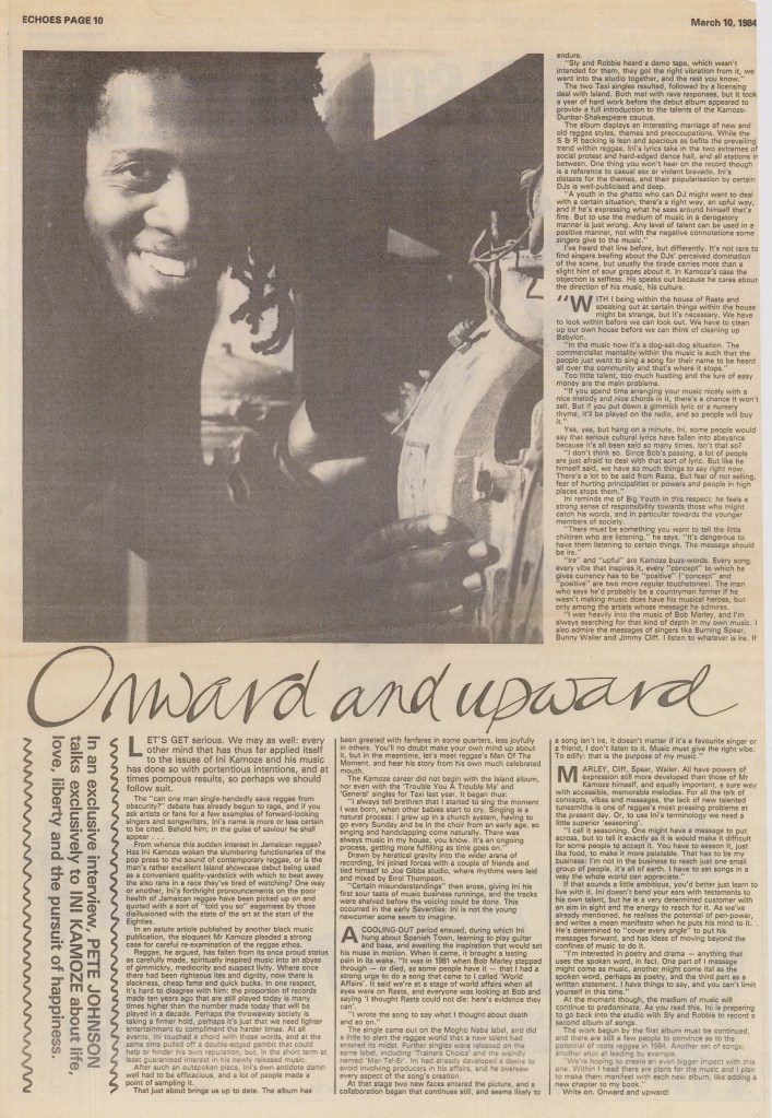 Also included here is an article on the Ini Kamoze from Black Echoes Magazine March 10, 1984.