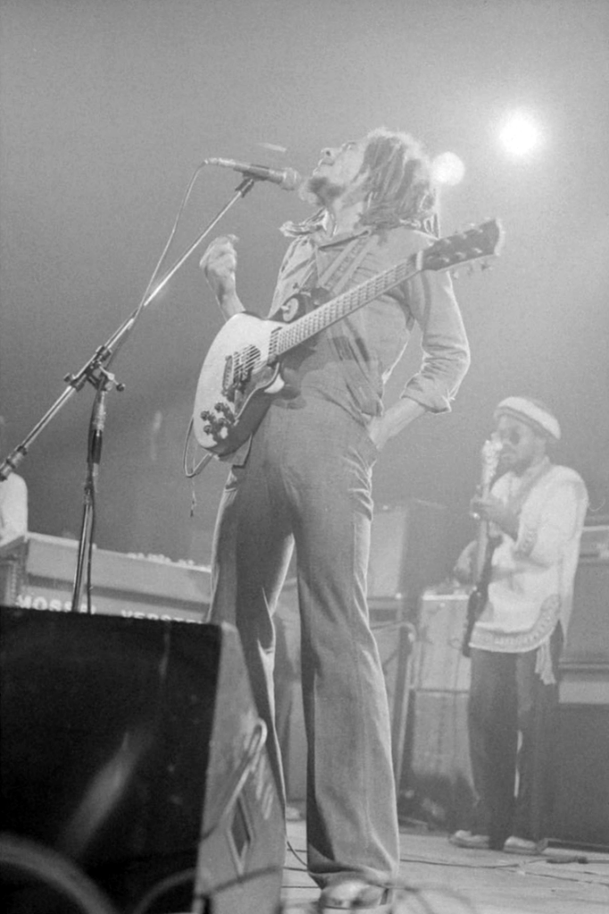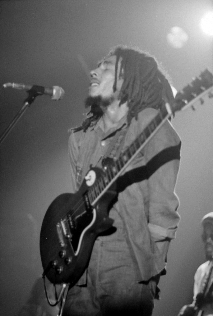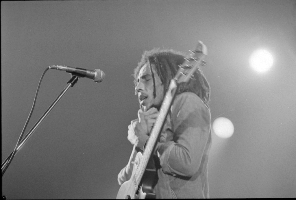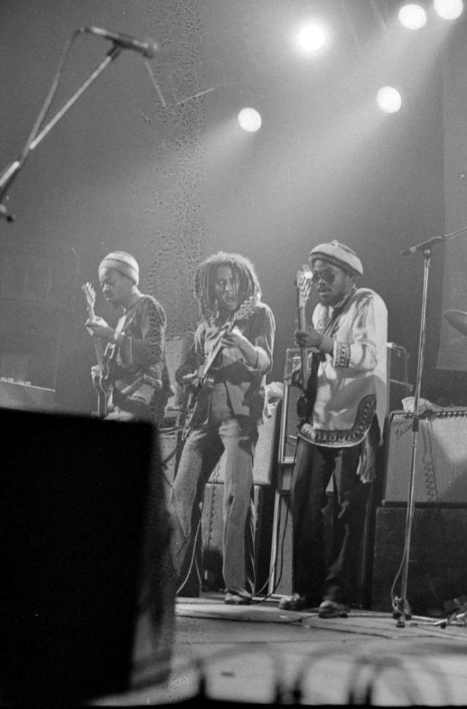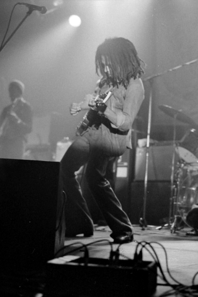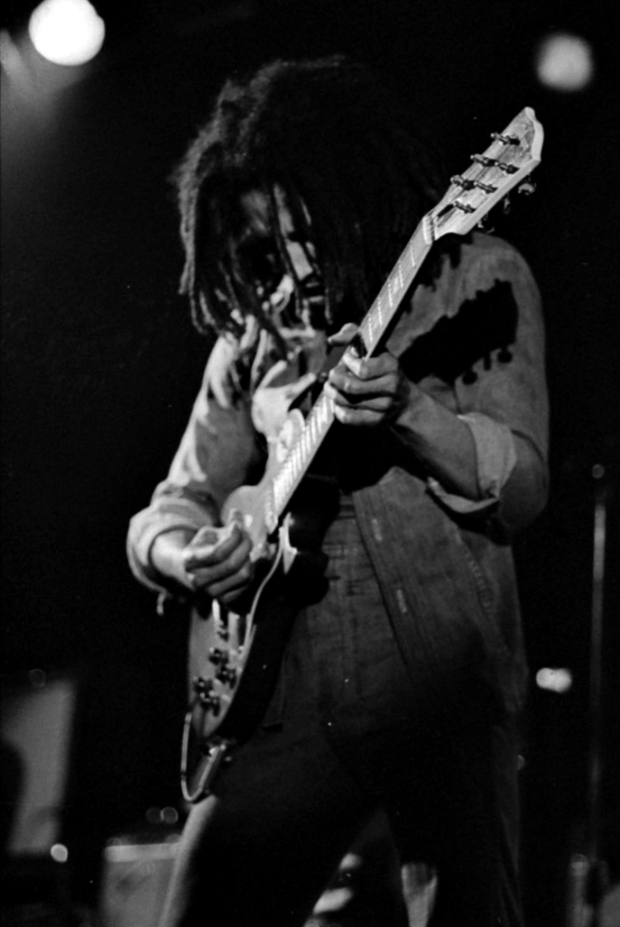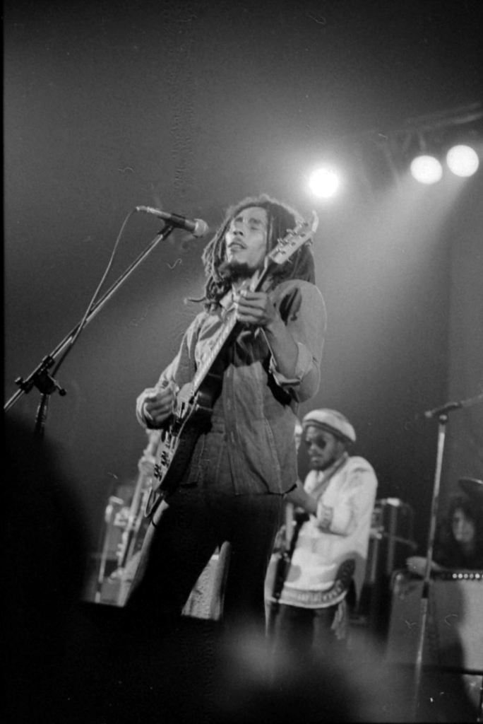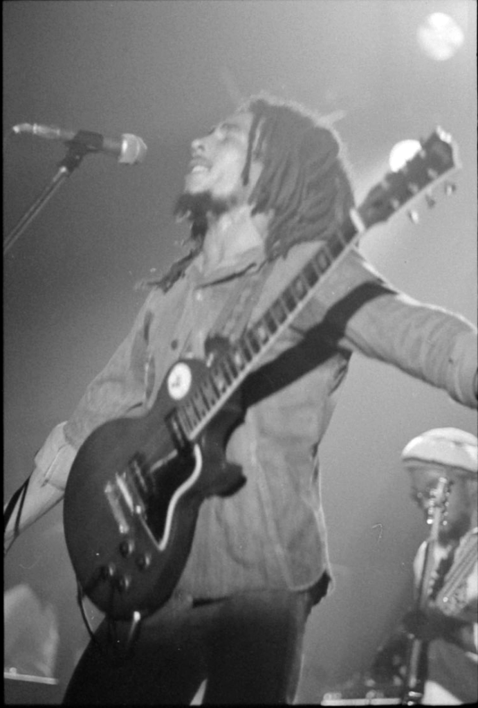 MIDNIGHT RAVER recently obtained 90 photo negatives of Bob Marley and the Wailers performing live at Jaap Edenhal, Netherlands on June 13, 1976.  The photos, taken by photographer LEX VAN ROSSEN (1940-2007), document Marley performing in the Netherlands for the very first time.  These photos are particularly noteworthy because they show guitarist Earl “Chinna” Smith on-stage with the band.  Chinna toured with the Wailers as guitarist on the 1976 tour.