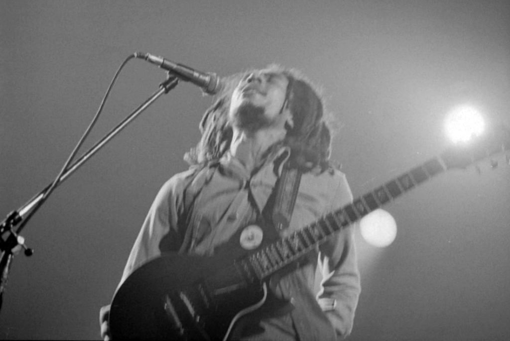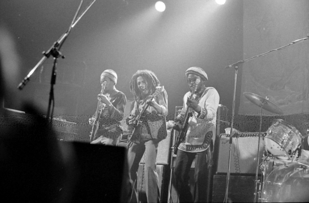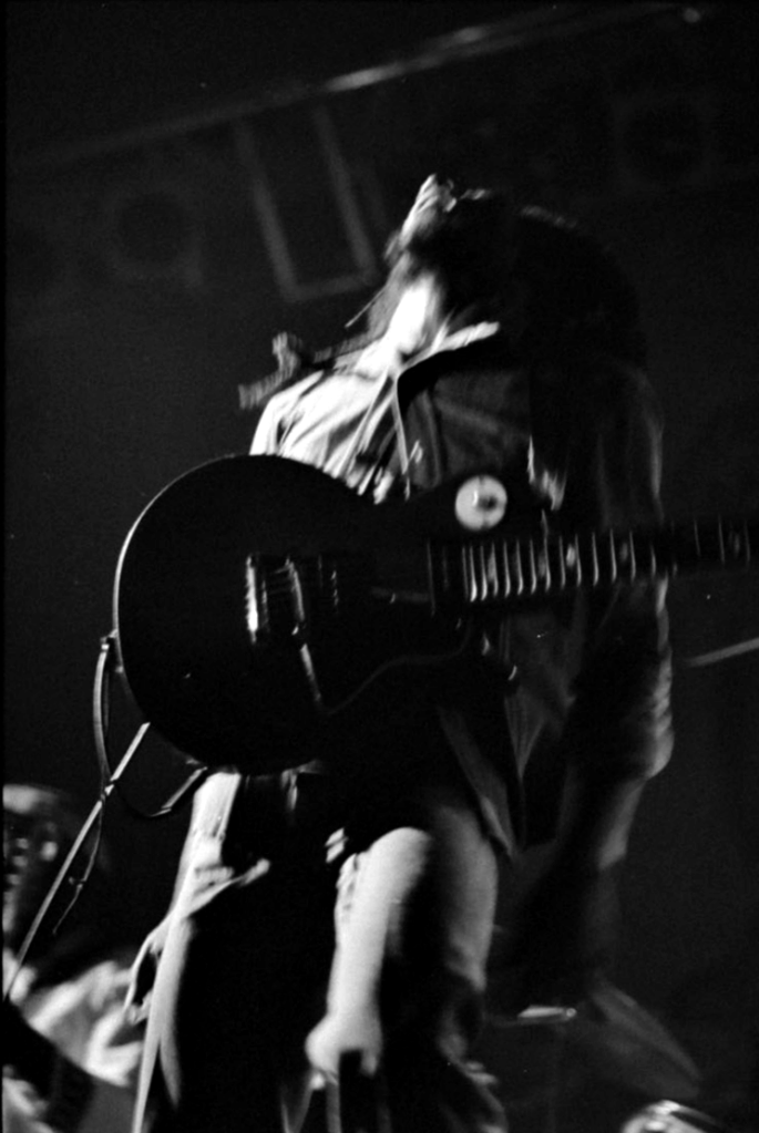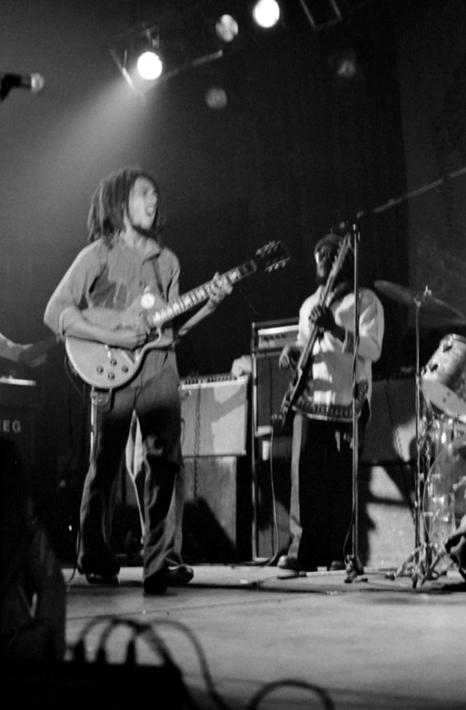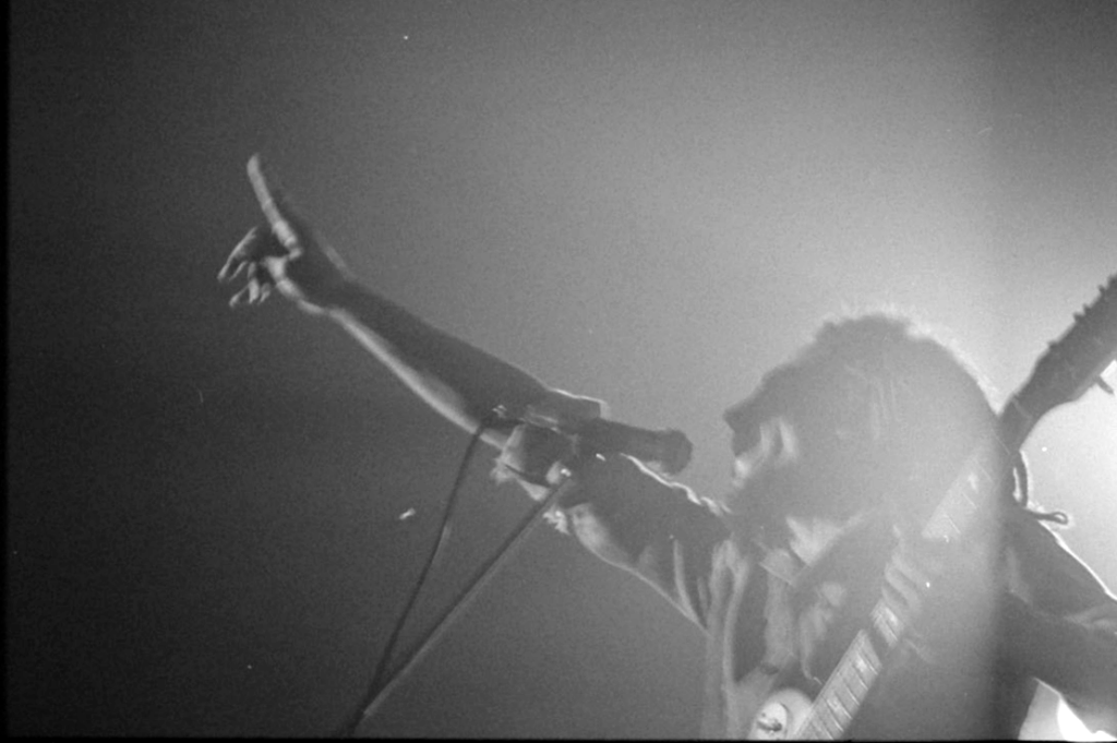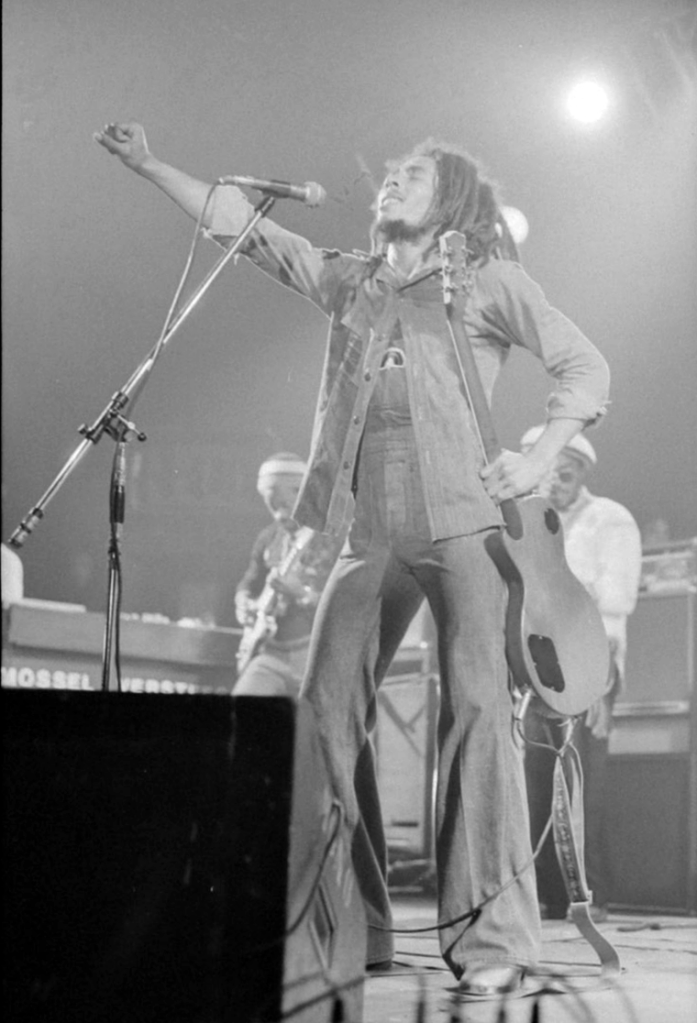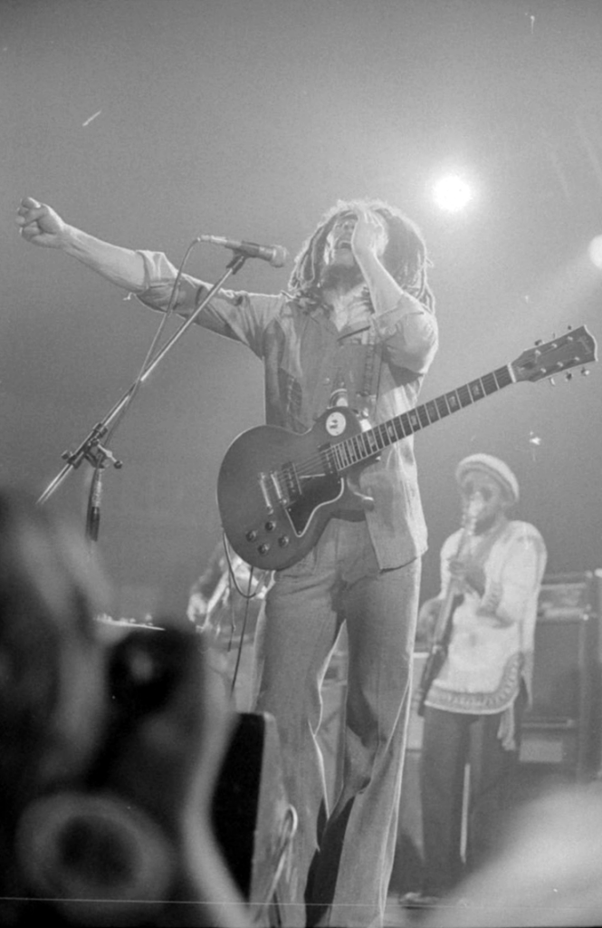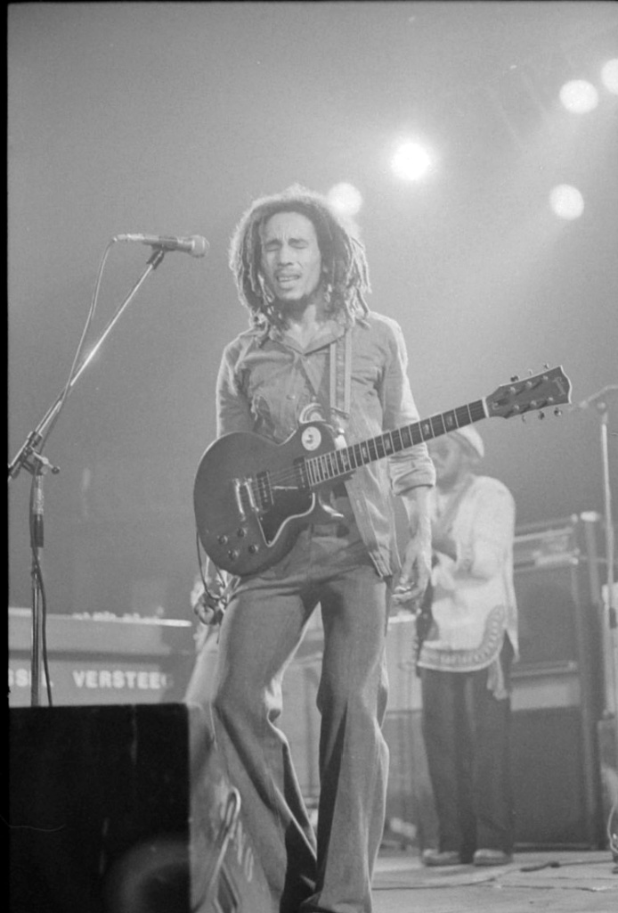 MIDNIGHT RAVER recently obtained 90 photo negatives of Bob Marley and the Wailers performing live at Jaap Edenhal, Netherlands on June 13, 1976.  The photos, taken by photographer LEX VAN ROSSEN (1940-2007), document Marley performing in the Netherlands for the very first time.  These photos are particularly noteworthy because they show guitarist Earl “Chinna” Smith on-stage with the band.  Chinna toured with the Wailers as guitarist on the 1976 tour.