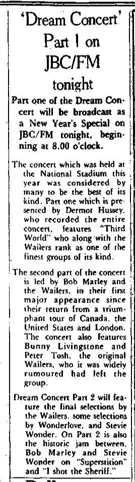 I have included four articles from the Jamaica Gleaner, the islands leading newspaper. These articles profile the Wonder Dream Concert over several weeks leading up to the show on October 4, 1975.