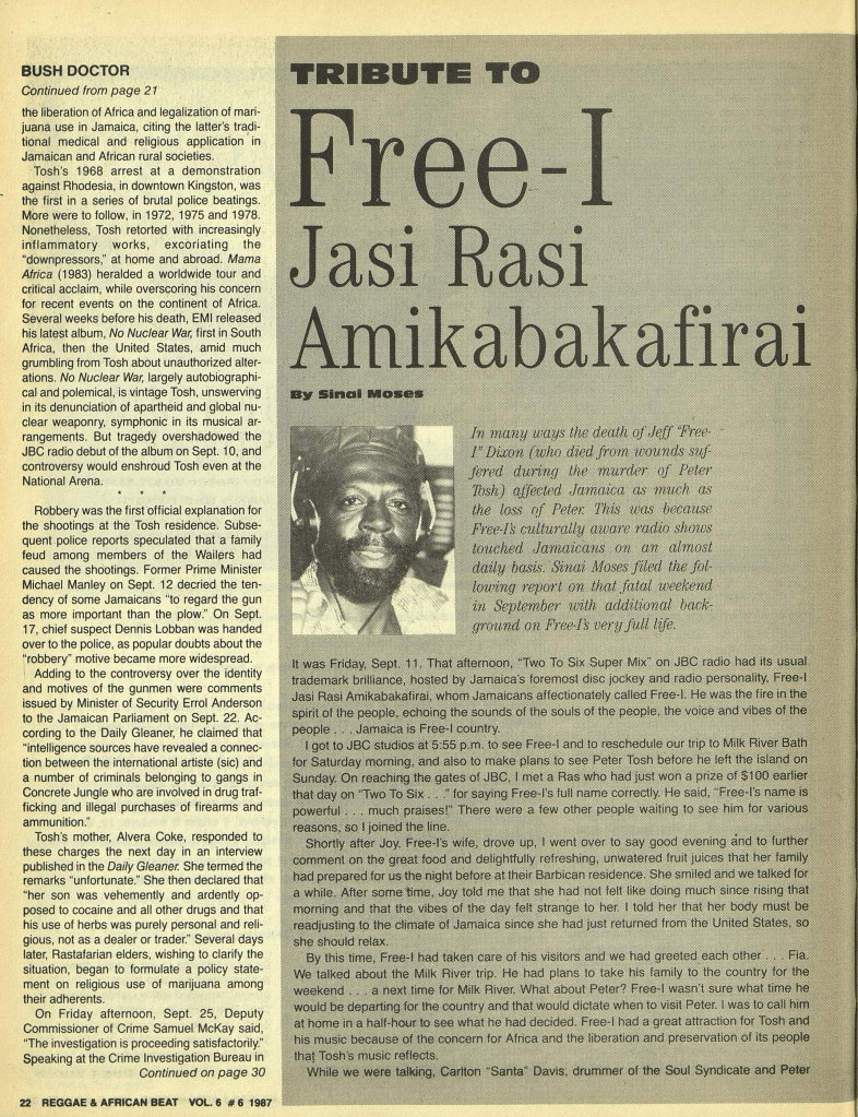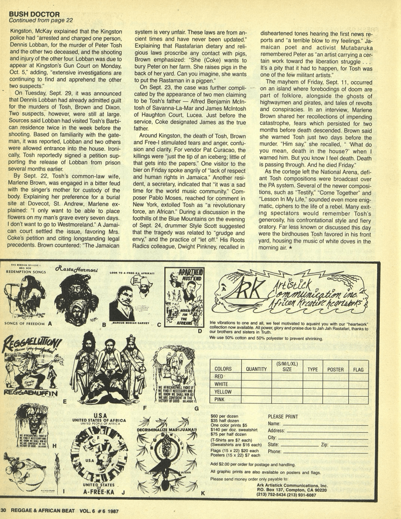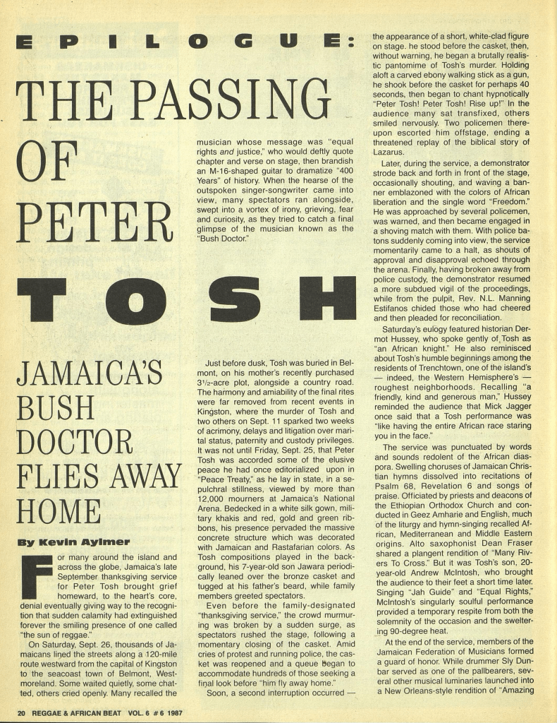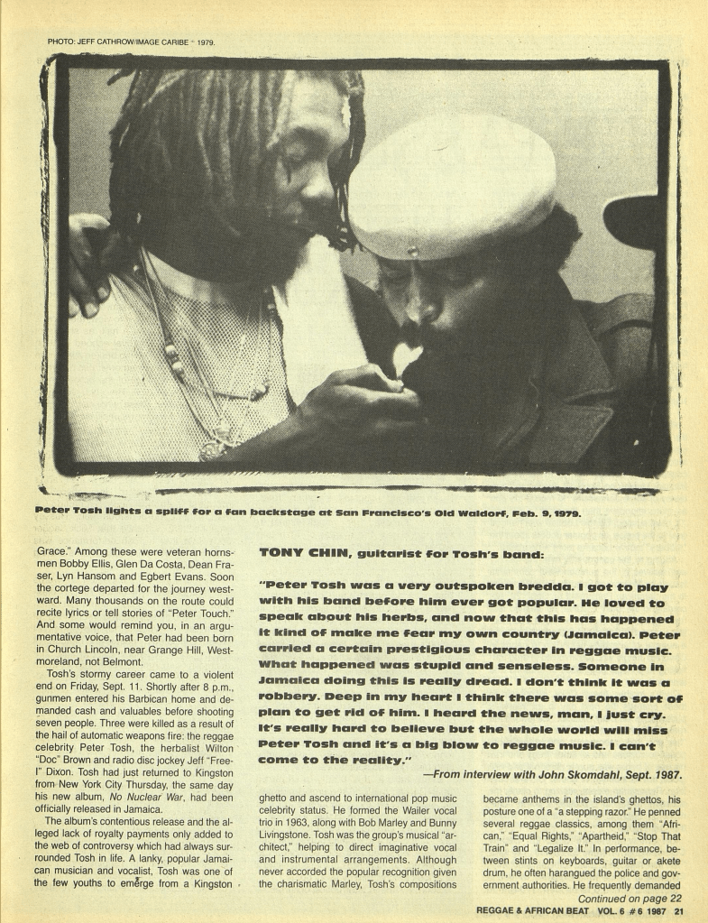 Here is a great feature on Tosh by Kevin Aylmer. It appeared in the December 1987 issue of The Beat.