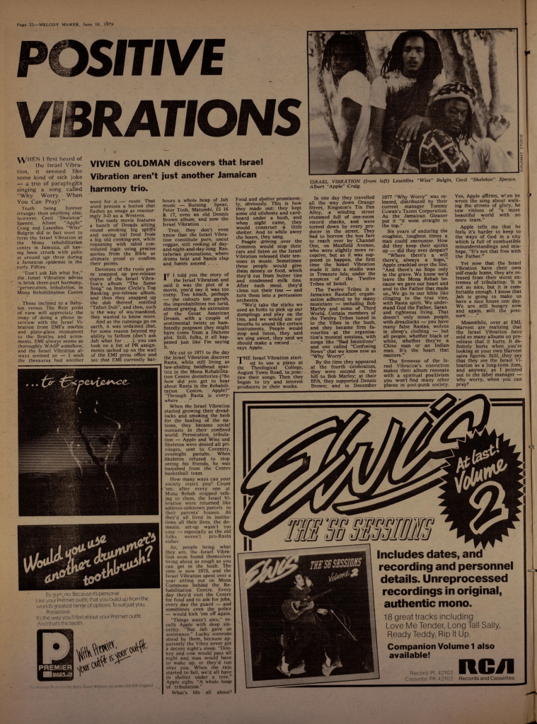 Also included here is a fascinating article on Israel Vibration by our good friend Vivien Goldman which appeared in the June 16, 1979 issue of Melody Maker.