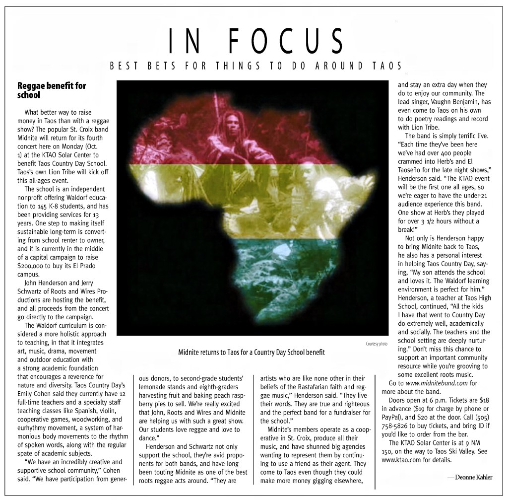 Here is a feature from the Taos, New Mexico News on September 27, 2007 about Midnite playing an annual benefit concert for a local school. Jah works…