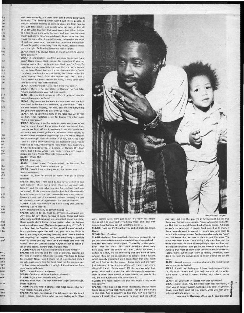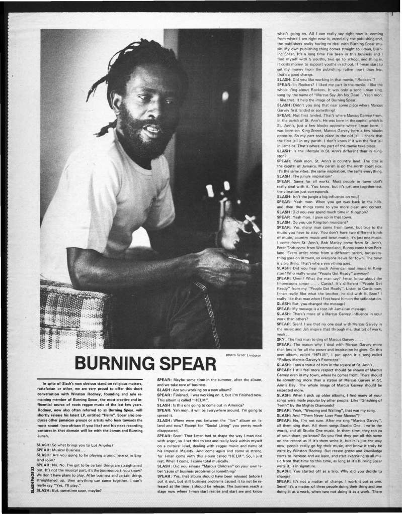 Yesterday was the earthstrong of the living legend Burning Spear. To commemorate this day I would like to share with you a rarely circulated interview with Spear from the underground Los Angeles punk zine Slash.