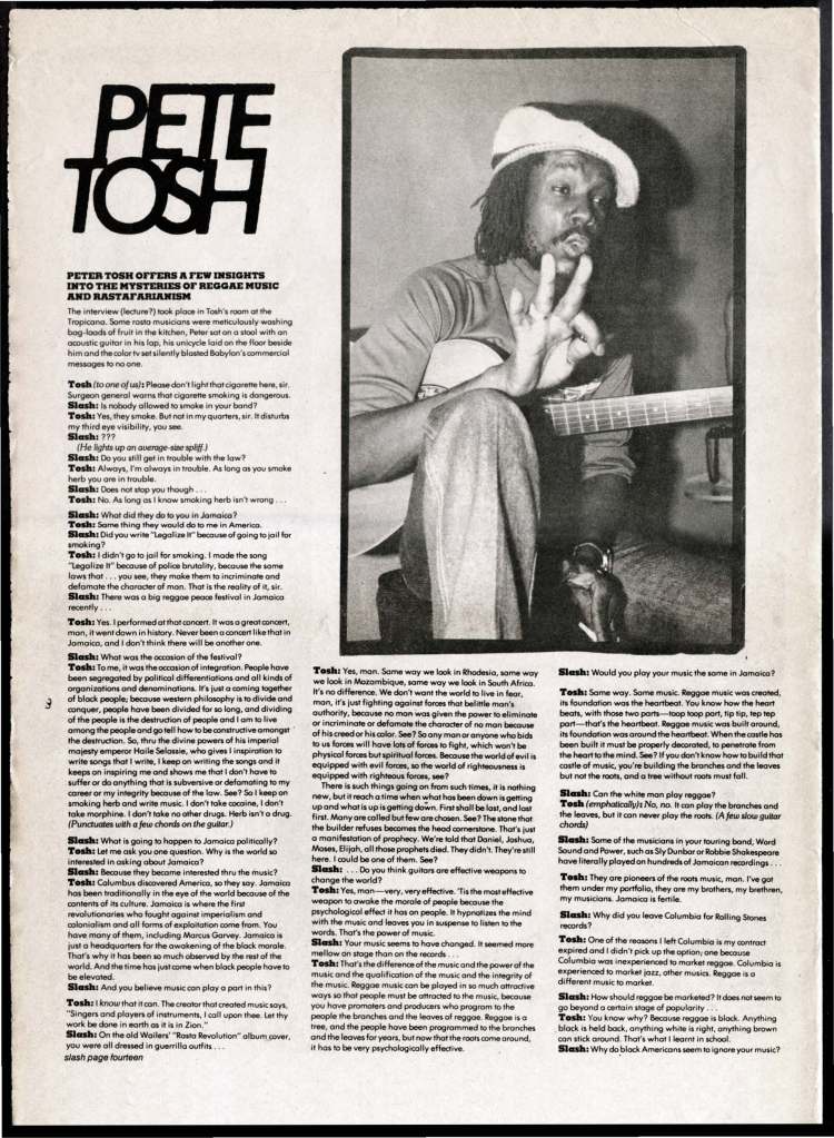 Included here is a rarely circulated interview with Peter Tosh that took place in Los Angeles in 1978. Evidently, this interview took place the same night that Tosh joined former bandmate Bob Marley on stage at the Starwood to sing “Get Up, Stand Up.” He discusses their plan to perform together during the interview.