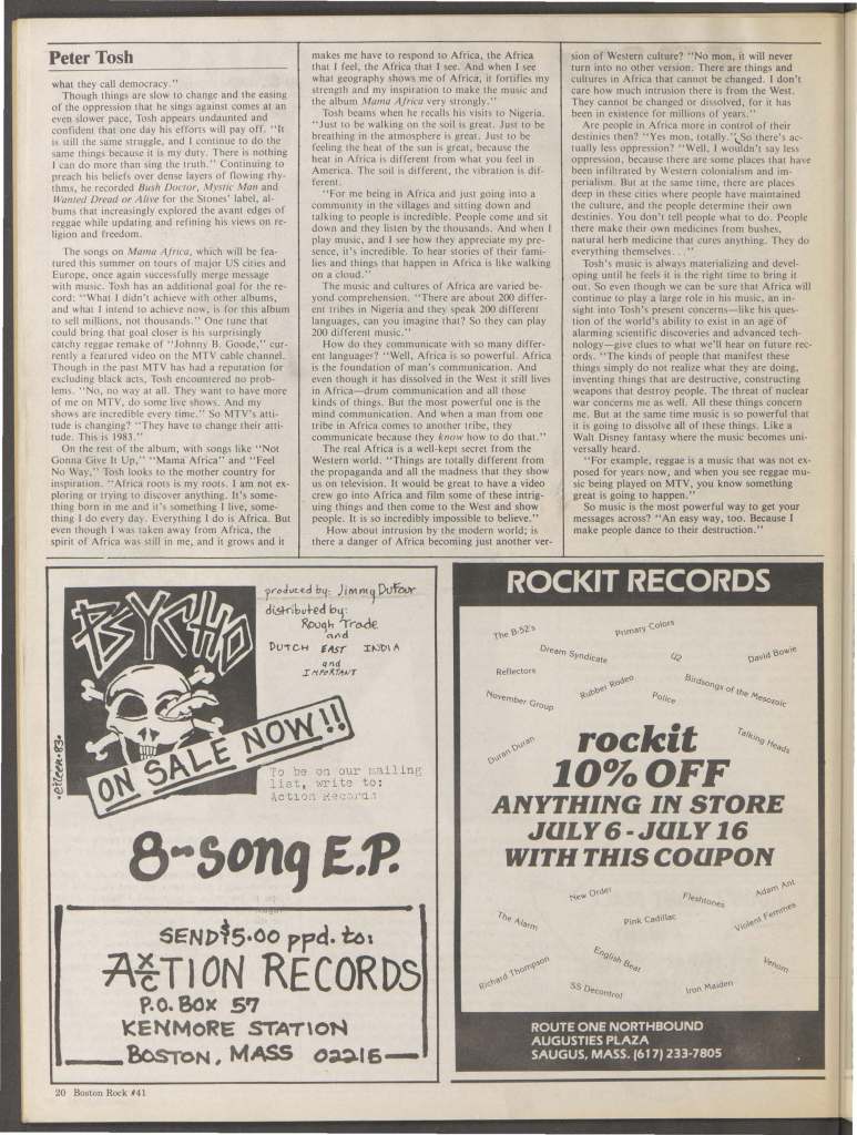 Also included here is an interview feature with Peter Tosh that appeared in Boston Rock Magazine in early 1983, just before Tosh embarked on the U.S. leg of his Mama Africa tour.