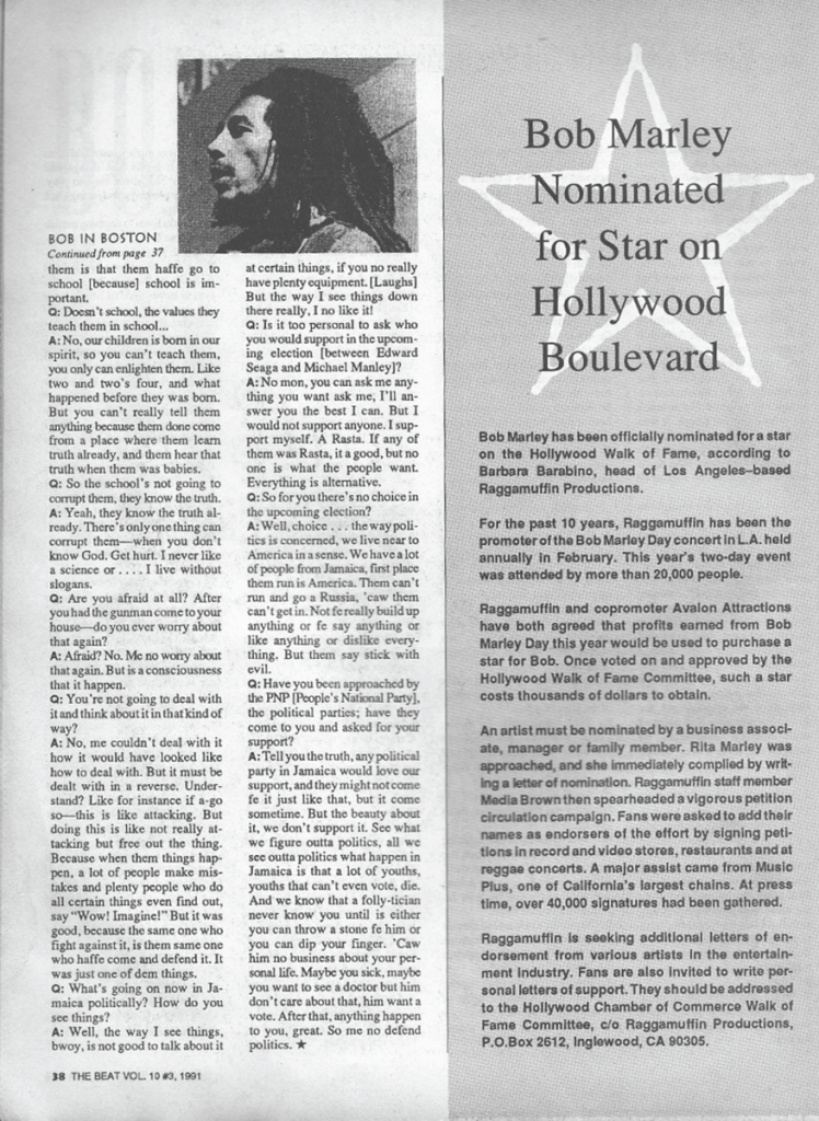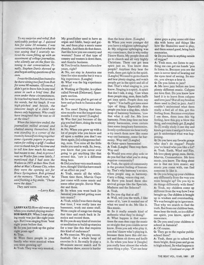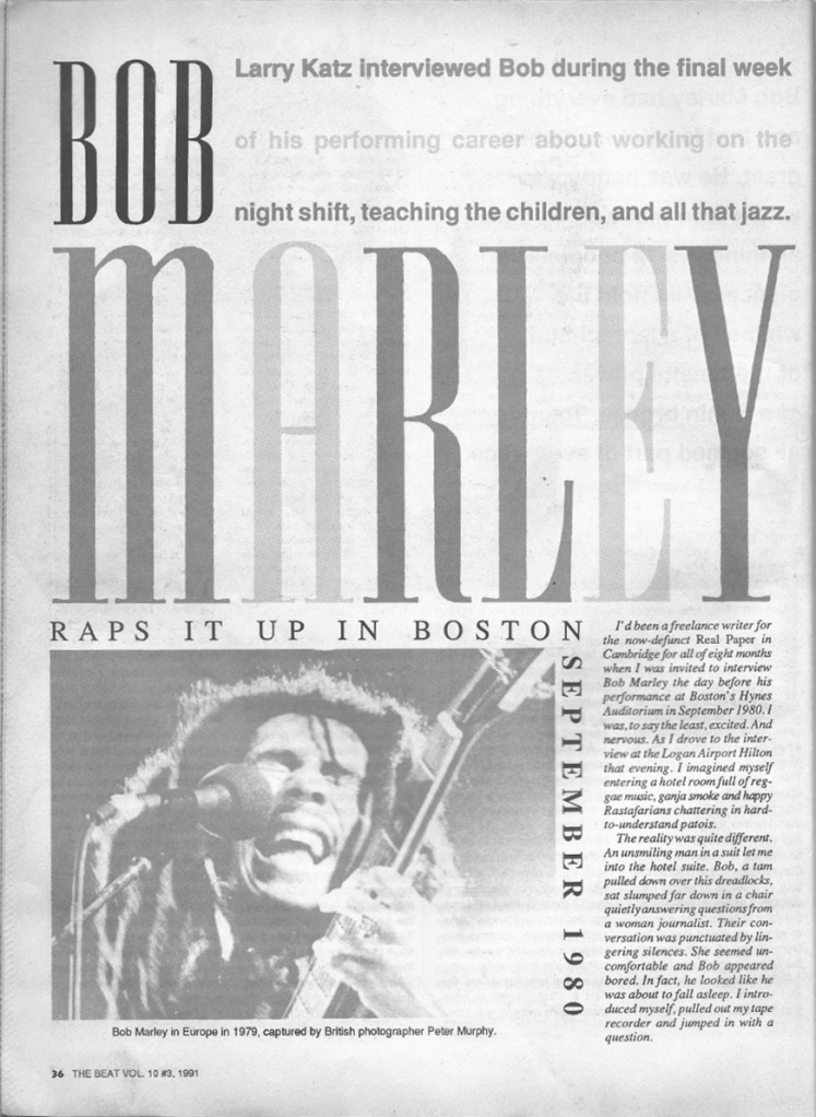 Included here is journalist Larry Katz’s 1980 interview with Bob Marley. Katz interviewed Marley the day before his show at Boston’s Hynes Auditorium on September 16, 1980. I have included both the audio interview as well as the written feature that appeared in The Beat in 1991. Also included here is live audio from Marley’s show in Boston.