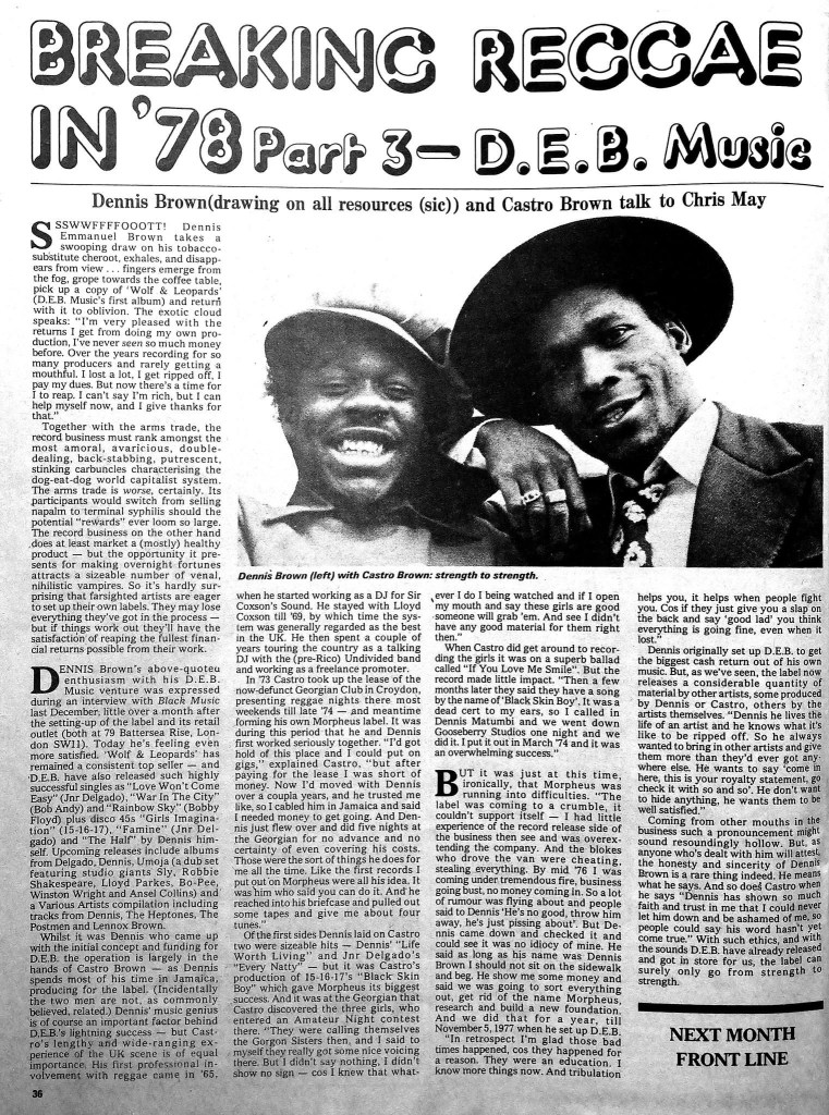 Dennis Brown’s legendary label D.E.B. Music is profiled in this feature by Chris May which appeared in the April 1978 issue of Black Music.