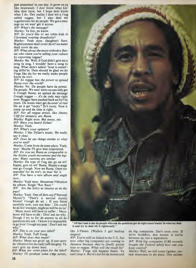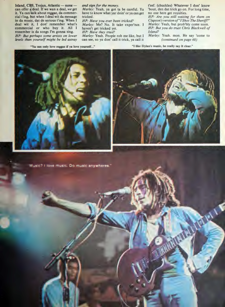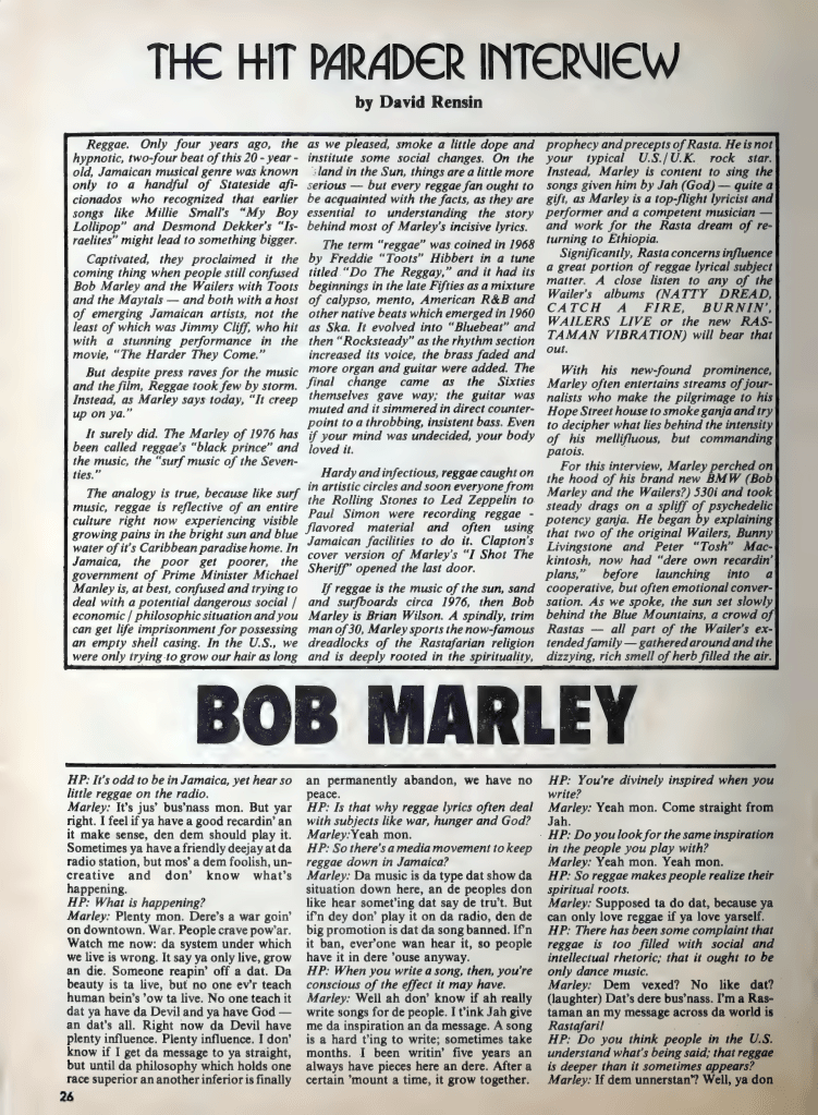 Bob Marley interview with David Rensin from Hit Parader Magazine, September 1976. In this rare interview feature Bob Marley talks about the political violoence in Jamaica, his success and notoriety in America and Europe, the meaning behind Tuff Gong, and his approach to making music.